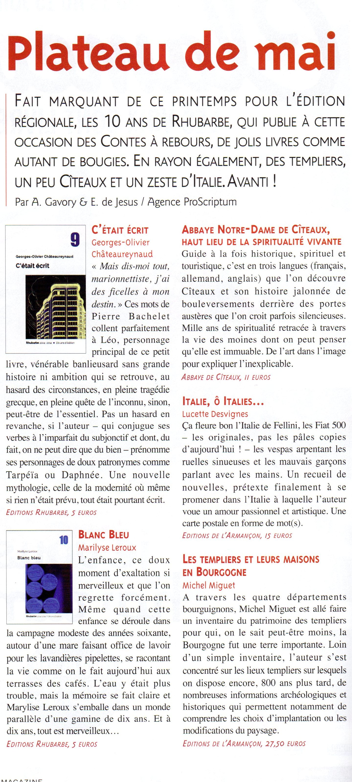 lire la note de lecture de La lectrice à l'oeuvre Bourgogne magazine (mai-juin 14)
